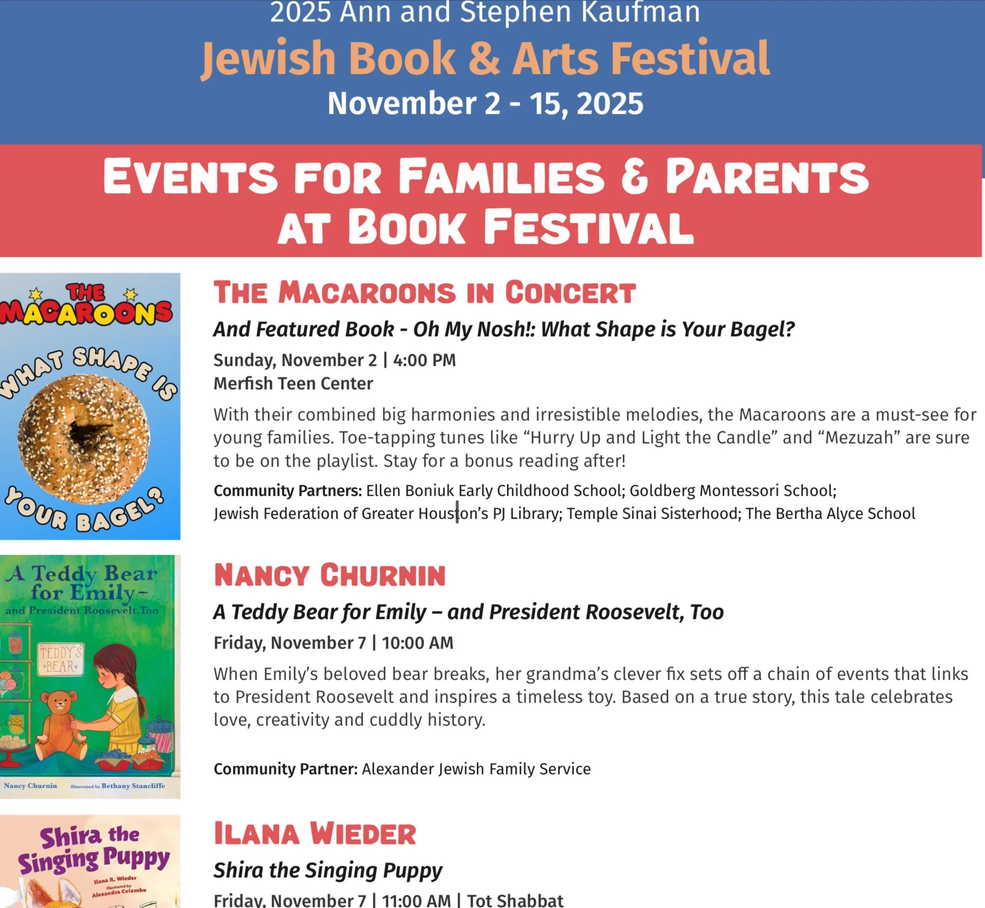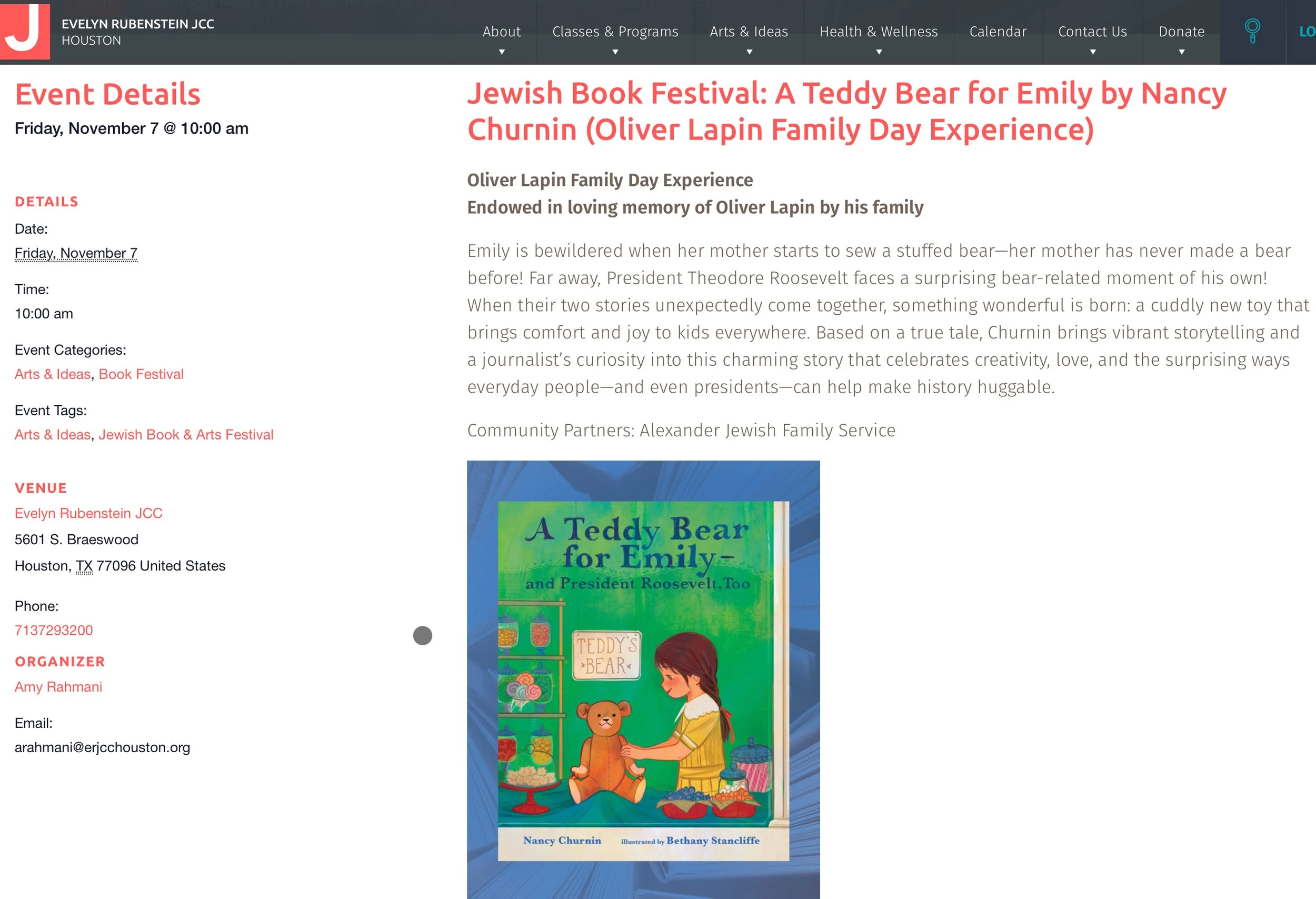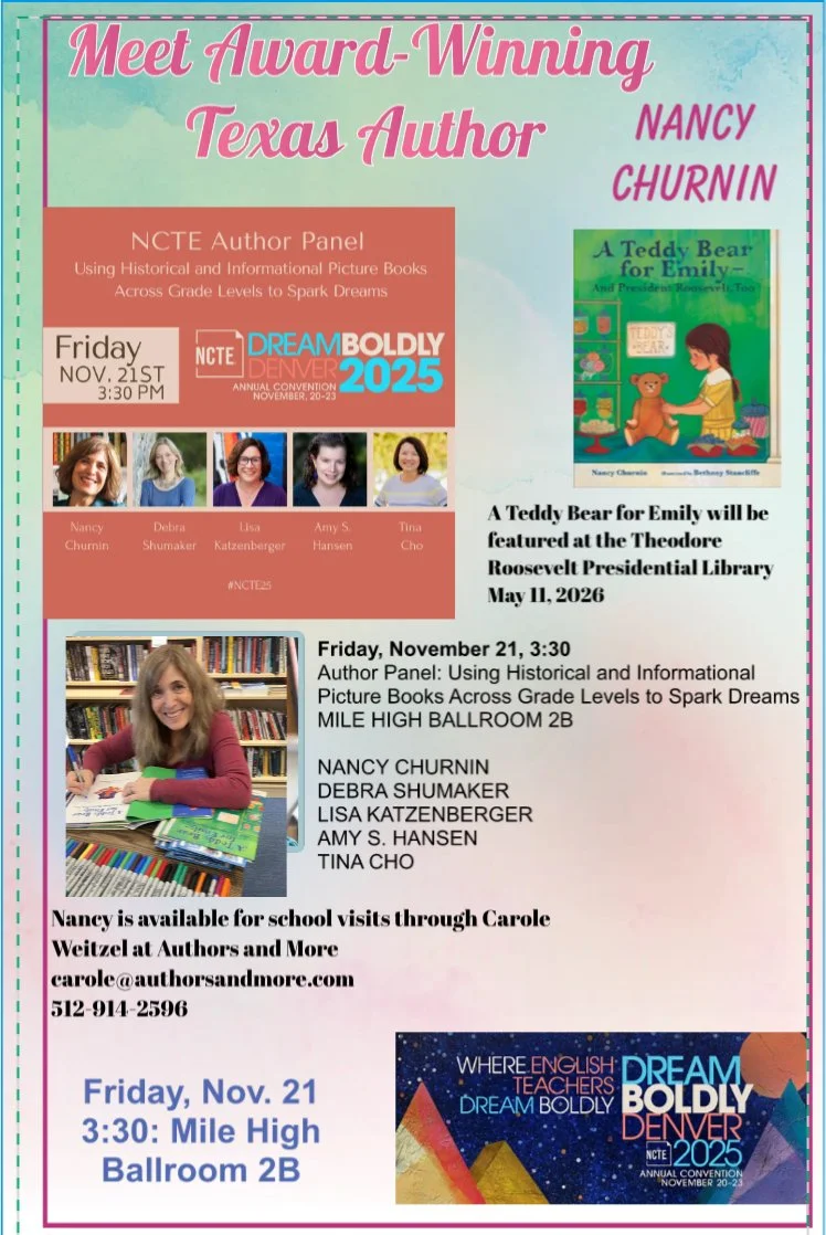 A Teddy Bear for Emily will be at the National Council of Teachers of English in Denver and at the Evelyn Rubinstein Jewish Book Festival in Houston, both in November 2025!