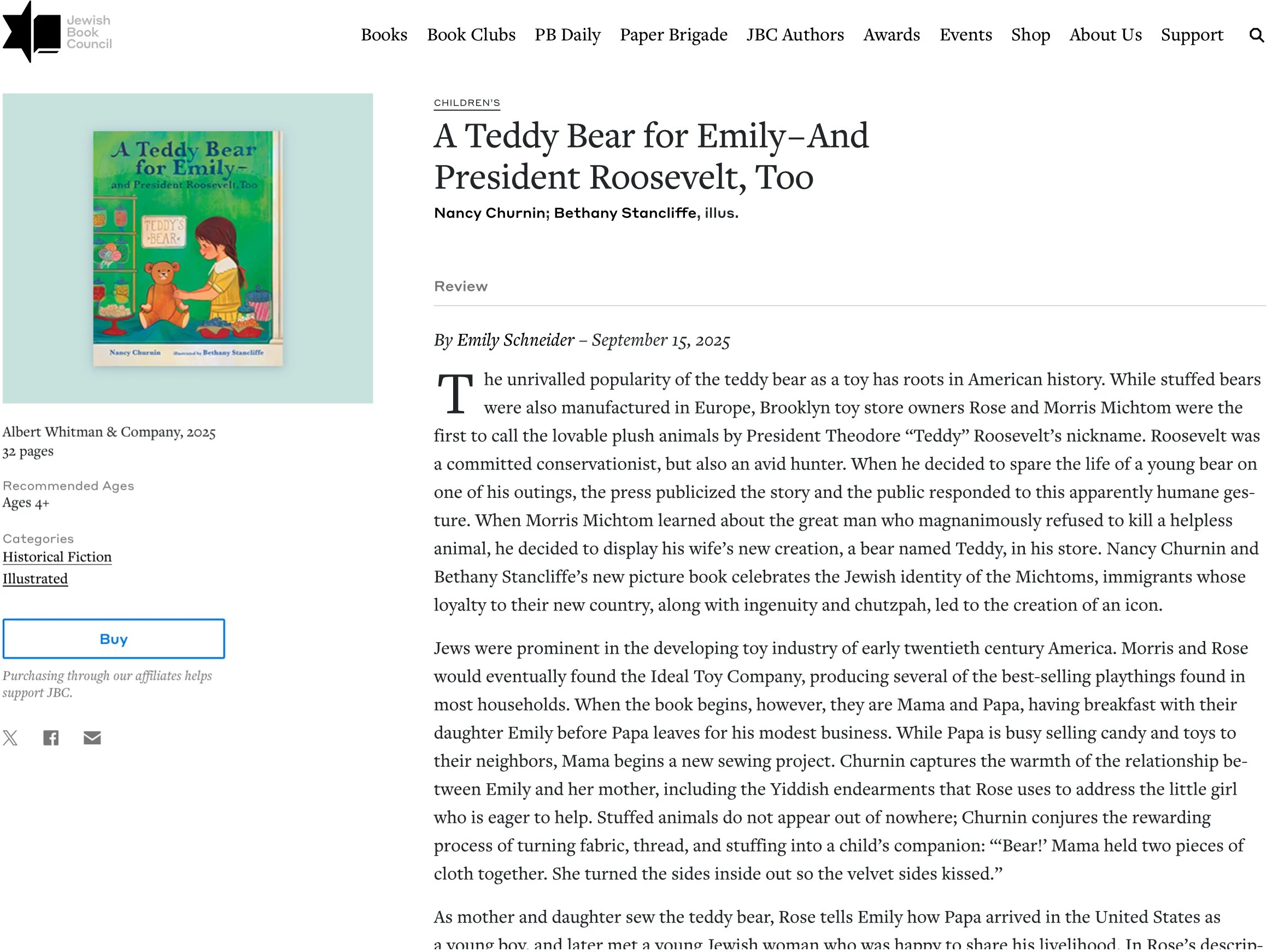 Thank you, Emily Schneider and Jewish Book Council! Read the full review here: https://www.jewishbookcouncil.org/book/a-teddy-bear-for-emily-and-president-roosevelt-too