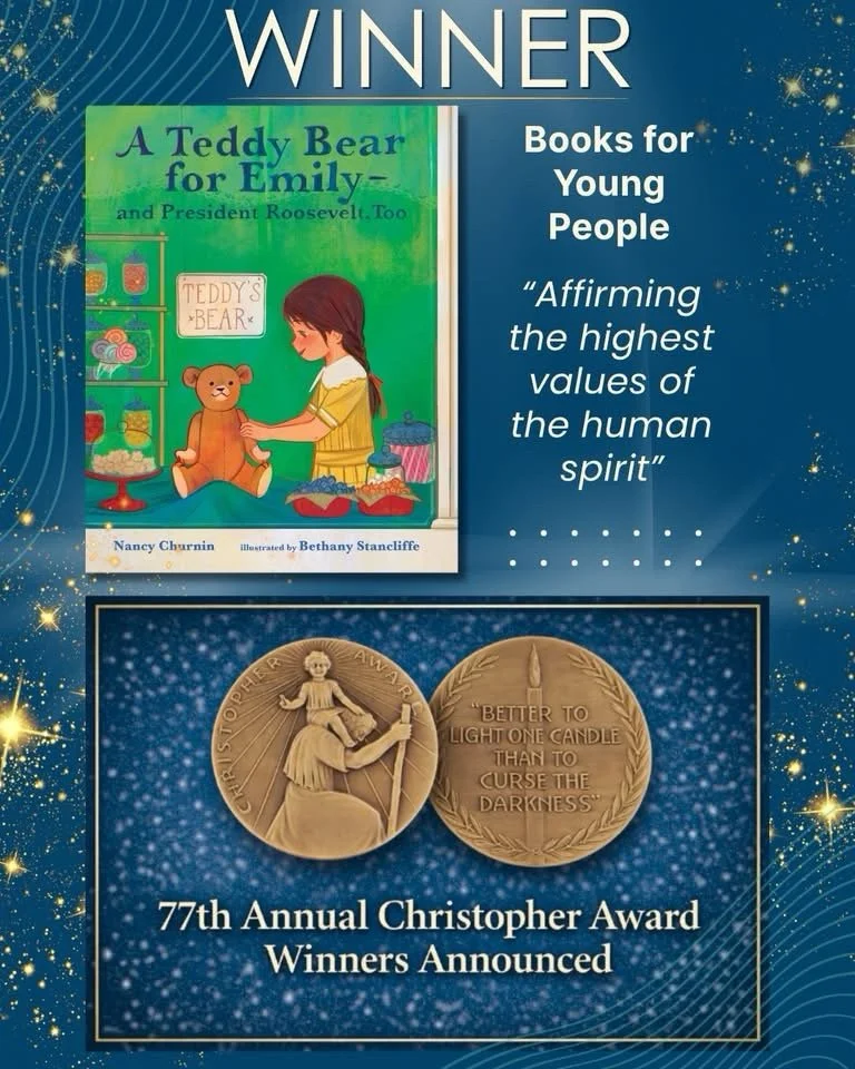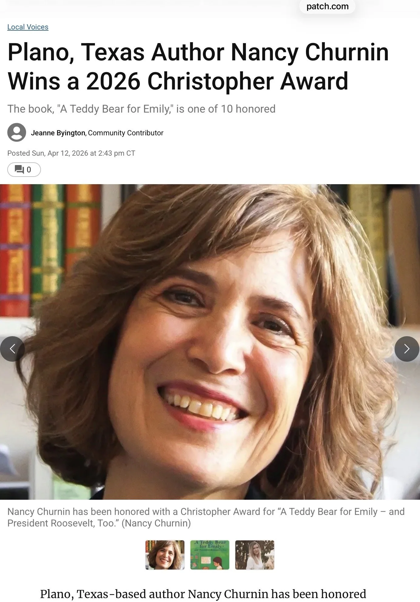 Thank you, National Today, for the lovely story about the Christopher Award for A Teddy Bear for Emily — and President Roosevelt, Too. Read it here: https://nationaltoday.com/us/tx/plano/news/2026/04/12/plano-author-nancy-churnin-wins-2026-christopher-award/#:~:text=Nancy%20Churnin%2C%20a%20children's%20book,%E2%80%93%20and%20President%20Roosevelt%2C%20Too.