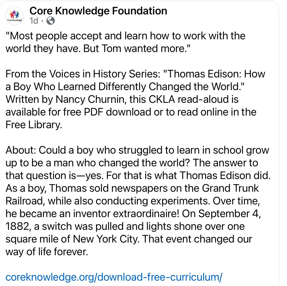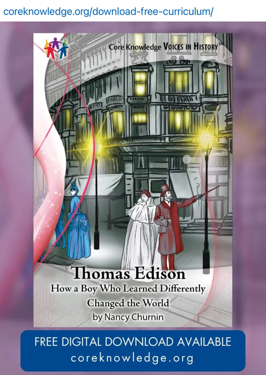 Visit coreknowledge.org/download-free-curriculum/ for free downloadable or low-cost paperback chapter book biographies of inventor Thomas Edison, freedom activist Elizabeth Freeman and artist Vincent van Gogh.