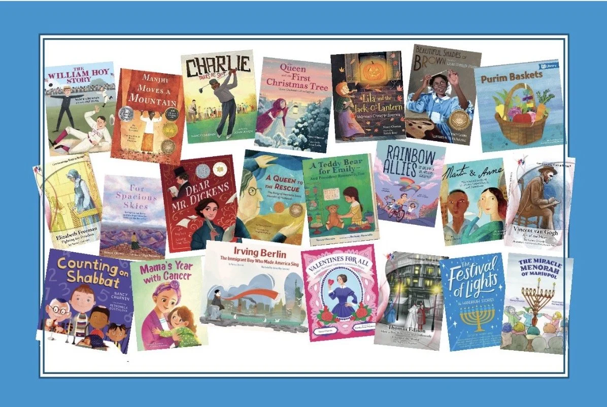 Published: THE WILLIAM HOY STORY, HOW A DEAF BASEBALL PLAYER CHANGED THE GAME; MANJHI MOVES A MOUNTAIN, CHARLIE TAKES HIS SHOT, HOW CHARLIE SIFFORD BROKE THE COLOR BARRIER IN GOLF; IRVING BERLIN, THE IMMIGRANT BOY WHO MADE AMERICA SING; THE QUEEEN AND THE FIRST CHRISTMAS TREE, QUEEN CHARLOTTE’S GIFT TO ENGLAND; MARTIN & ANNE, THE KINDRED SPIRITS OF DR. MARTIN LUTHER KING, JR. AND ANNE FRANK.; BEAUTIFUL SHADES OF BROWN, THE ART OF LAURA WHEELER WARING; FOR SPACIOUS SKIES, KATHERINE LEE BATES AND‘AMERICA THE BEAUTIFUL’; DEAR MR. DICKENS; A QUEEN TO THE RESCUE, THE STORY OF HENRIETTA SZOLD; MAMA’S YEAR WITH CANCER; VALENTINES FOR ALL, ESTHER HOWLAND CAPTURES AMERICA’S HEART; LILA AND THE JACK-O’-LANTERN, HALLOWEEN COMES TO AMERICA; COUNTING ON SHABBAT; THOMAS EDISON, HOW A BOY WHO LEARNED DIFFERENTLY CHANGED THE WORLD; ELIZABETH FREEMAN, FIGHTING FOR FREEDOM; VINCENT VAN GOGH, ART FROM THE HEART; RAINBOW ALLIES; FESTIVAL OF LIGHTS; A TEDDY BEAR FOR EMILY — AND PRESIDENT ROOSEVELT, TOO; PURIM BASKETS.